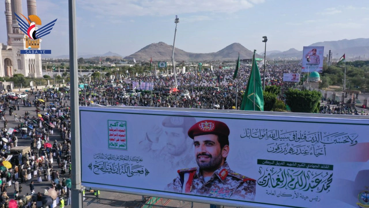 وأوضح بيان صادر عن المسيرة المليونية ألقاه عضو المكتب السياسي لأنصار الله - عضو اللجنة الوطنية العليا لنصرة الأقصى ضيف الله الشامي، أنه وتتوجياً للخروج الذي وفقنا الله له وكان بفضله سبحانه وتعالى، الخروج الذي لا مثيل له في الدنيا بكلها، وتعظيماً ووفاء للشهداء الذين هم وقود مسيرتنا وشواهد صدق توجهنا واستجابة لله وحباً له ورغبة فيما عنده، وخوفاً من عذابه، وثباتاً على كتابه ونهجه، وتحت راية من اصطفاهم من عباده، نزف كشعب يمني - اختار الجهاد في سبيل الله طريقاً له - بكل افتخار واعتزاز إلى الأمة العربية والإسلامية وكل أحرار العالم قائداً جهادياً عظيماً، وفارساً من فرسان الإسلام، القائد الجهادي الكبير الفريق الركن محمد عبد الكريم الغماري رئيس هيئة الأركان العامة.