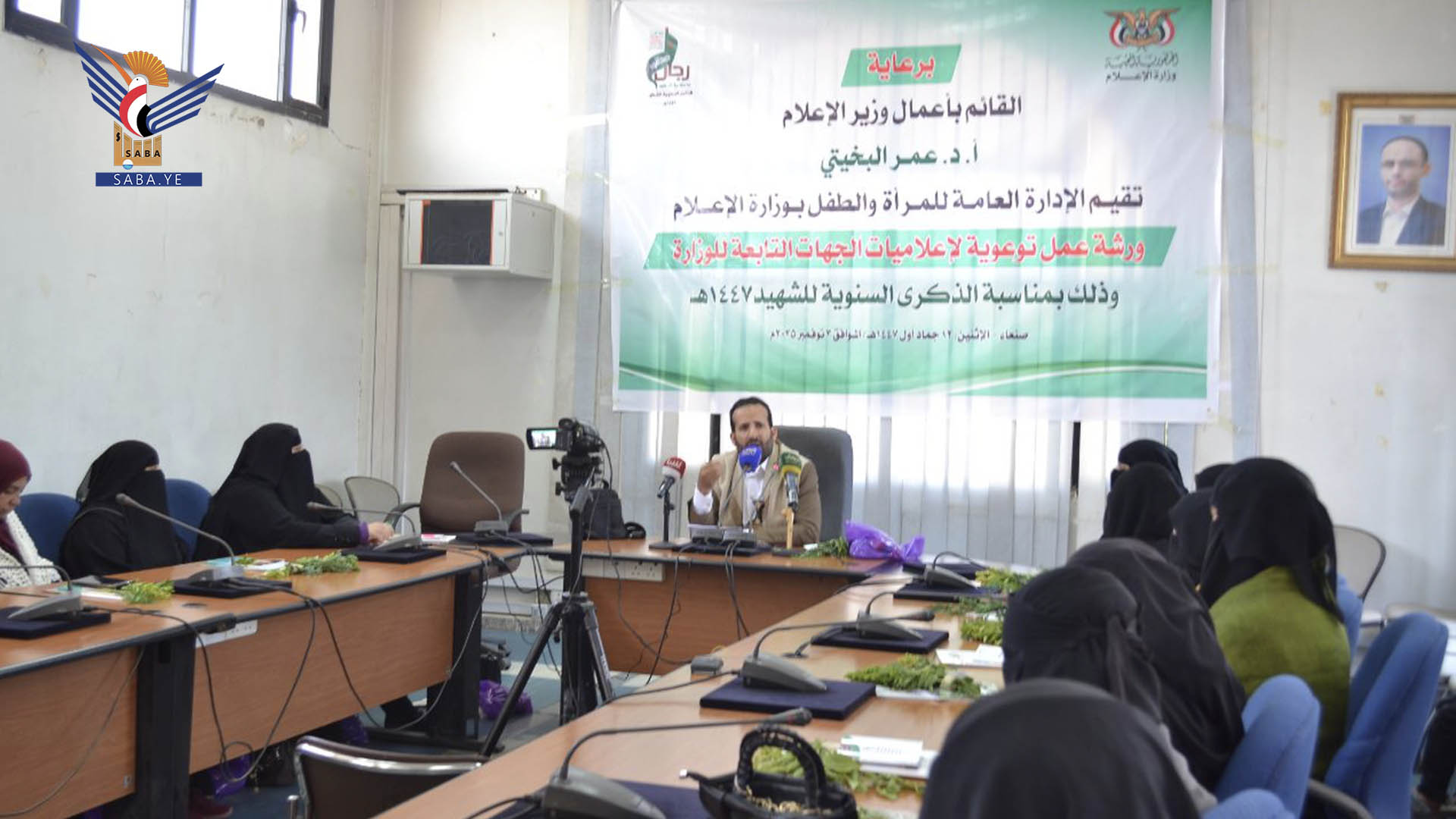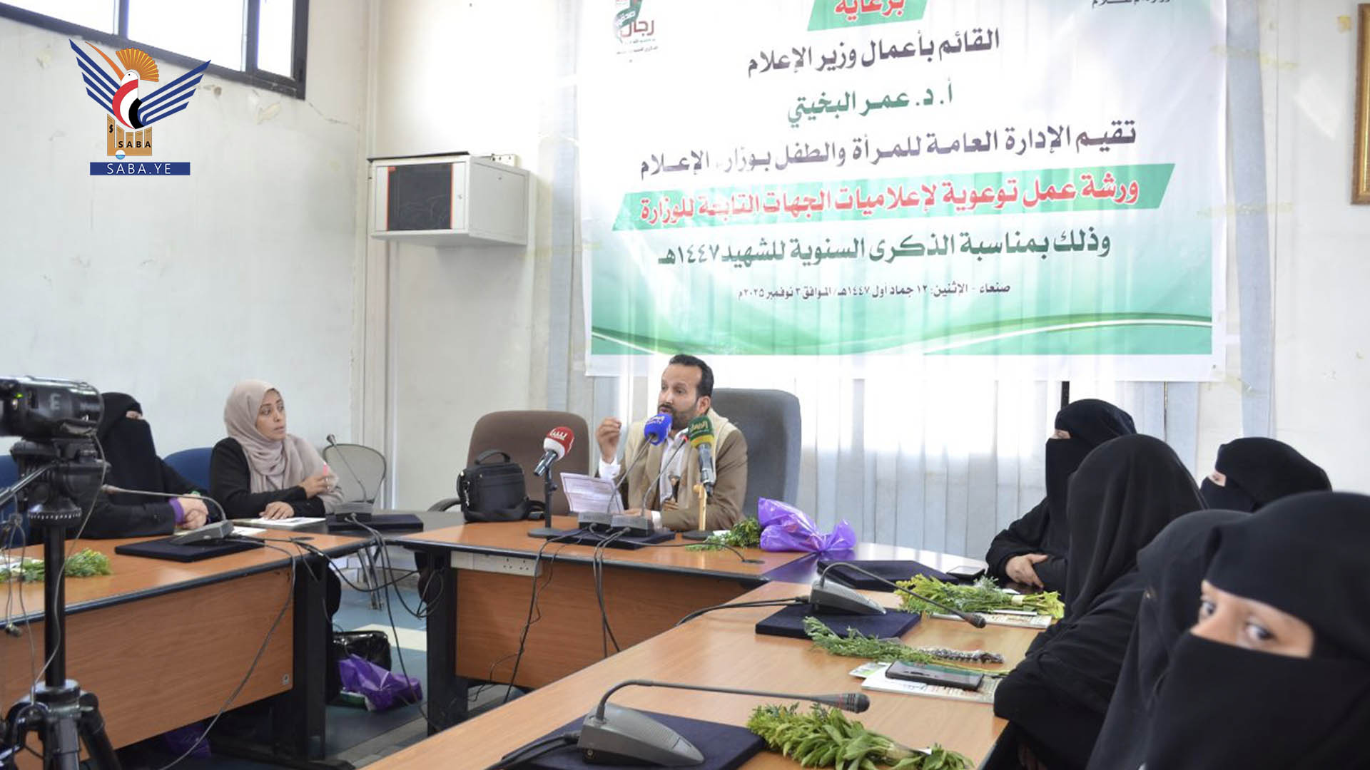 نظمت الإدارة العامة للمرأة والطفل بوزارة الإعلام، اليوم بصنعاء، ورشة عمل توعوية لإعلاميات الجهات التابعة للوزارة بالذكرى السنوية للشهيد 1447هـ.