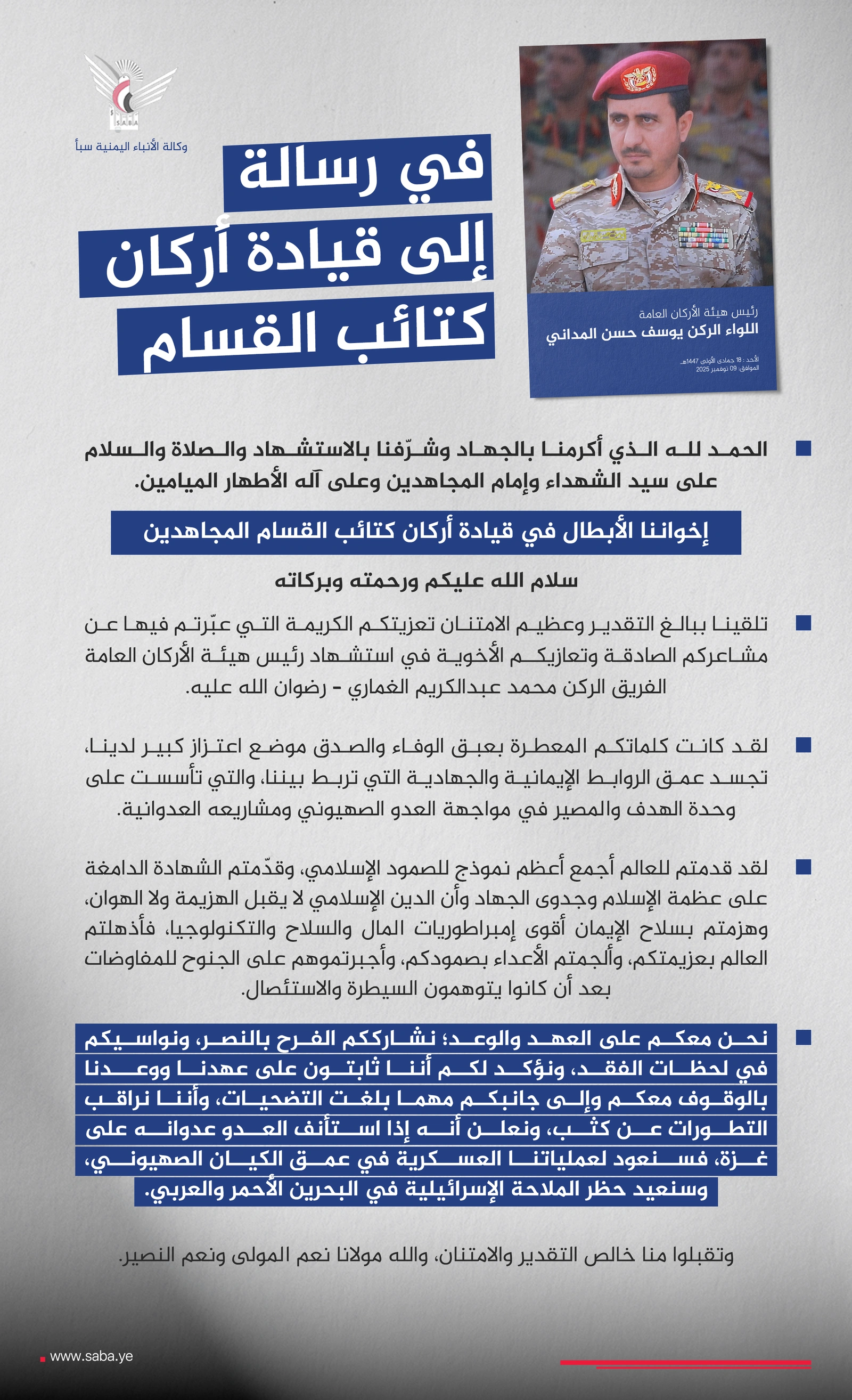 تناولت وكالة أنباء "أسوشيتد برس" الأمريكية ومنصات عبرية رسالة رئيس هيئة الأركان العامة للقوات المسلحة اليمنية، اللواء الركن يوسف المداني، إلى كتائب القسام - الجناح العسكري لحركة المقاومة الإسلامية "حماس".