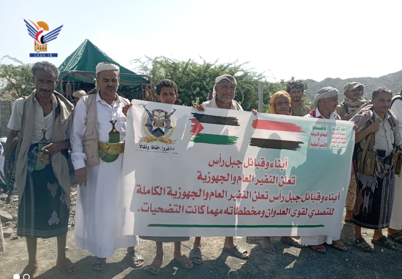 نظمت قبائل مديرية جبل راس بمحافظة الحديدة، اليوم، وقفة مسلّحة وفاءً للشهداء وإعلاناً للنفير لمواجهة أعداء اليمن، تحت شعار "وفاءً لدماء الشهداء.. التعبئة مستمرة".