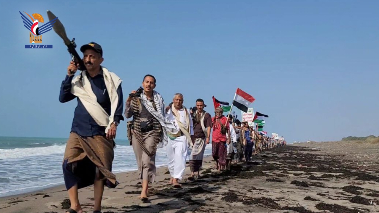 انطلق المسير، الذي نفذه 250 من الملتحقين بدورات التدريب والتأهيل العسكري، على امتداد الساحل البحري بمناسبة اختتام مشاركتهم في الدورة، مؤكدين التفويض للقيادة وتنفيذ كل الخيارات لنصرة فلسطين والجهاد في سبيل الله، والتصدي لأي محاولات من الغزاة المحتلين والمتربصين باليمن والأمة.