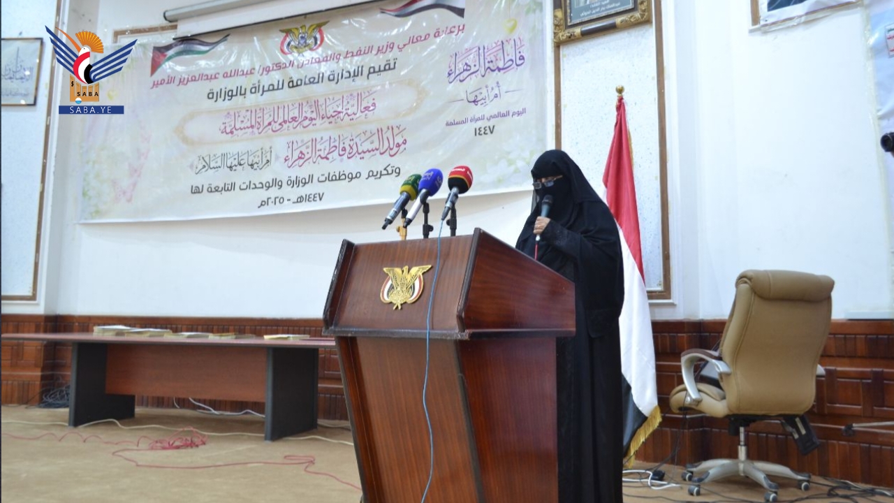 نظمّت الإدارة العامة للمرأة بوزارة النفط والمعادن، اليوم بصنعاء، فعالية خطابية باليوم العالمي للمرأة المسلمة ـ ذكرى ميلاد السيدة فاطمة الزهراء عليها السلام وتكريم موظفات الوزارة والوحدات التابعة لها.