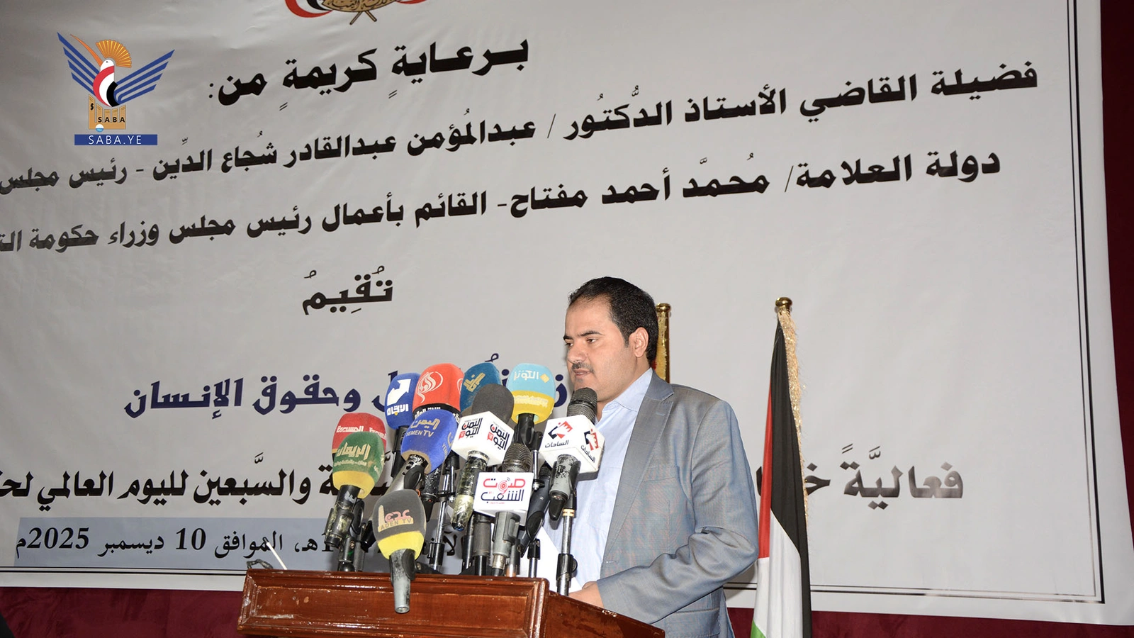 وأشار إلى أن الإنسان اليمني حُرم خلال هذه المدة من أبسط حقوقه المكفولة في المواثيق الدولية كحقه في الحياة، والصحة، والتنقل، والأمن والكرامة، وتحول اليمن، تحت نيران العدوان السعودي، الإماراتي، الأمريكي، البريطاني، الصهيوني، إلى مختبر حي لكافة أنواع الأسلحة المحرمة دوليًا، وإلى مساحة لاختراق كل المواثيق الدولية، وانتهاك القيم الإنسانية.