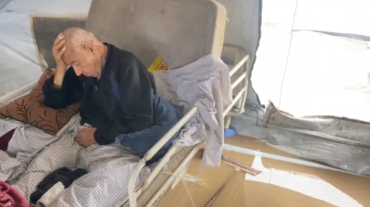 امرأة فلسطينية مسنة داخل خيمتها الغارقة بمياه الأمطار، ومعها زوجها الراقد على سرير المرض، لكن الصورة كانت نازفة للغاية، إذ لم تتوقف المأساة عند هذا الحد؛ فالمياه أحاطت برب الأسرة العليل من كل جانب، ومثل هذا المشهد أصبح مألوفا بالنسبة لأهالي غزة.
