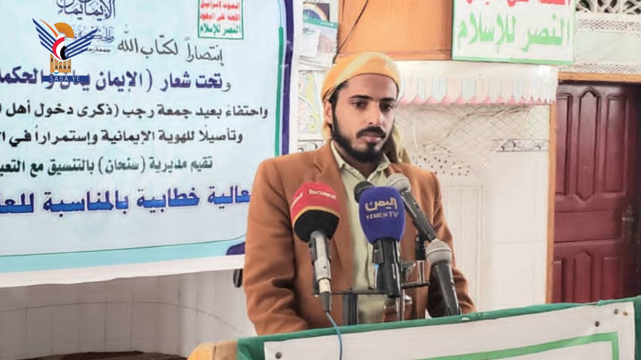 نظمّت بمديرية سنحان وبني بهلول، محافظة صنعاء، اليوم فعالية خطابية، انتصارًا لكتاب الله عز وجل، واحتفاءً بقدوم مناسبة عيد جمعة رجب - ذكرى دخول أهل اليمن الإسلام تحت شعار "الإيمان يمان والحكمة يمانية".