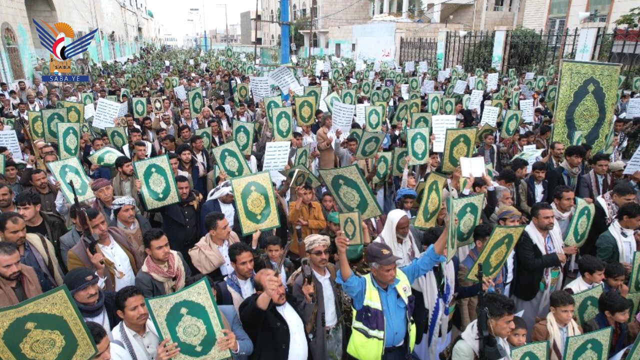 وأوضح بيان صادر عن المسيرات أن يتعرض له القرآن الكريم أقدس مقدسات الإسلام من حملات إساءة متكررة وممنهجة جزء من الحرب اليهودية الصهيونية الشاملة التي تستهدف الإسلام والمسلمين ومقدساتهم وتتزعمها أمريكا وإسرائيل وبريطانيا ويتبعهم في ذلك أولياء الشيطان الرجيم.