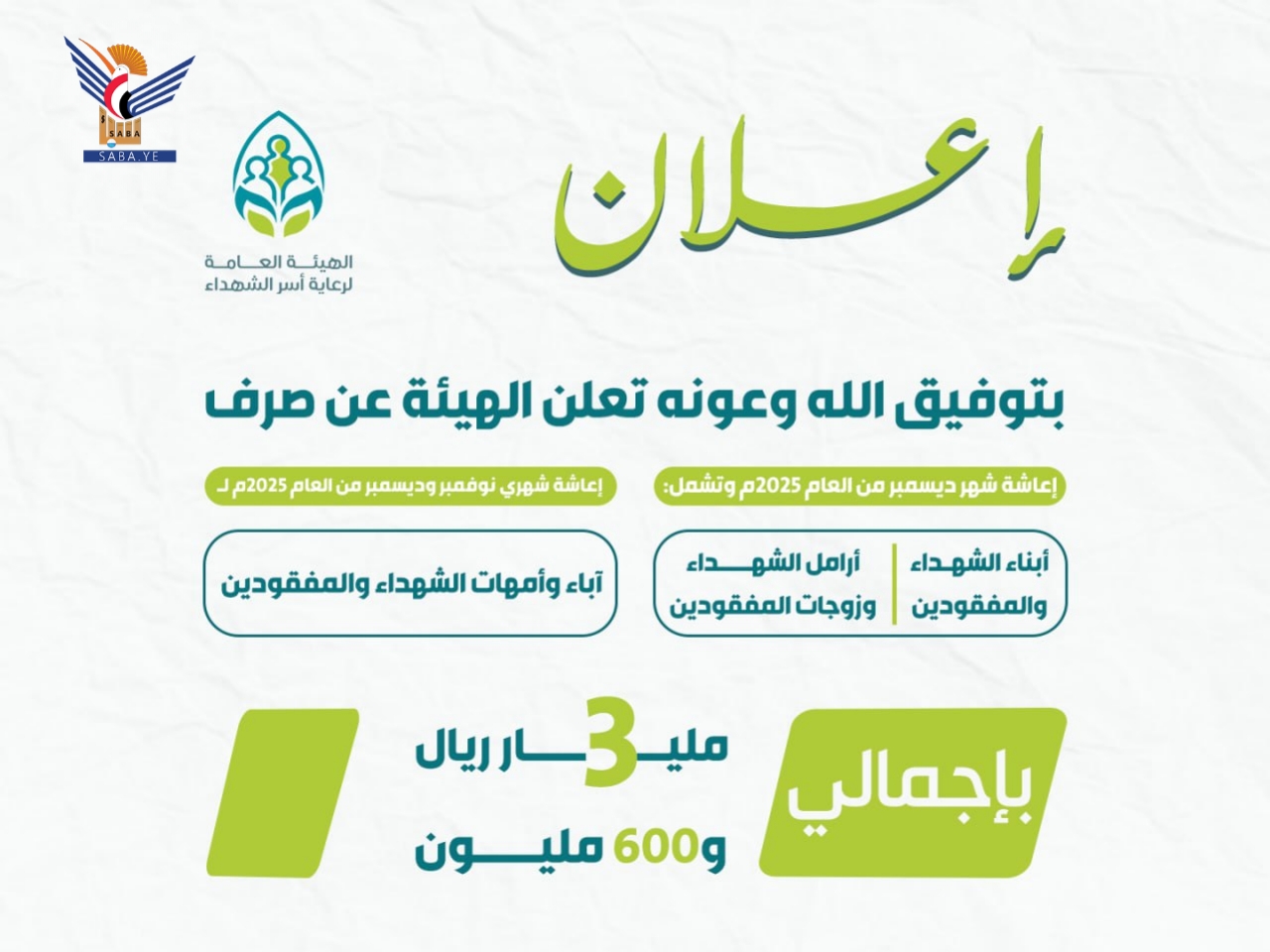 أعلنت الهيئة العامة لرعاية أسر الشهداء عن بدء صرف إعاشة شهر ديسمبر لأبناء الشهداء والأرامل وزوجات المفقودين، وإعاشة شهري نوفمبر وديسمبر لآباء وأمهات الشهداء والمفقودين، للعام 2025م بتداءً من اليوم الجمعة.