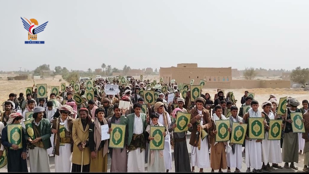 شهدت محافظة الجوف مسيرات ووقفات حاشدة، عبّرت عن حالة النفير والاستنفار العام نصرةً للقرآن الكريم، وتأكيدًا على الموقف الثابت والداعم للشعب الفلسطيني ومقاومته، ورفضًا لجرائم العدو الصهيوني والانتهاكات المتواصلة بحق المقدسات الإسلامية.