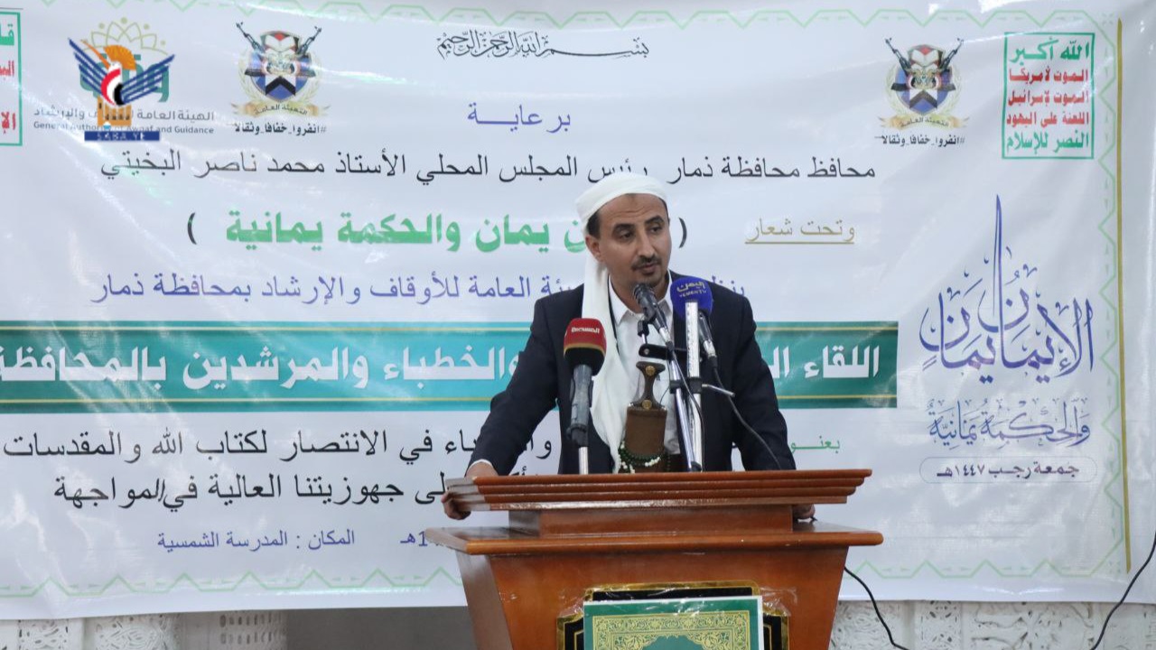 وحثّ محافظ ذمار العلماء والخطباء والمرشدين على أن يكونوا عونًا للسلطة المحلية، وأن يؤدّوا دورهم الجهادي، وتوظيف المنبر في تنوير الناس بأمور دينهم ودنياهم، ومواجهة أعداء الله الذين يتربّصون بالوطن والأمة.