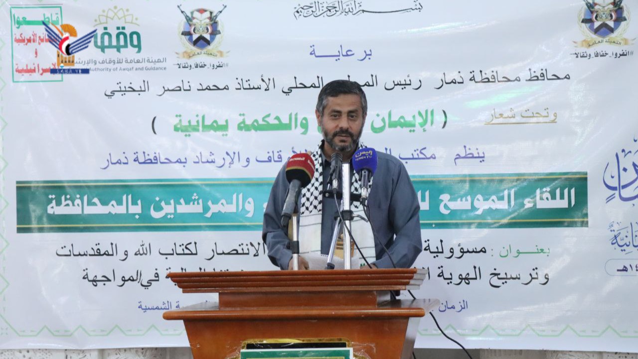 وفي اللقاء، الذي نظّمه فرع الهيئة العامة للأوقاف والإرشاد بالمحافظة، تحت شعار «الإيمان يمان والحكمة يمانية»، أوضح محافظ ذمار محمد البخيتي أن الأمة الإسلامية مستهدفة عسكريًا واقتصاديًا وفكريًا، وأن الإساءات المتكررة للقرآن الكريم عمل منظّم وممنهج يستوجب الرد، وأن السكوت عنها ستتبعه إجراءات قد تُضيّق على المسلمين في الدول الغربية.