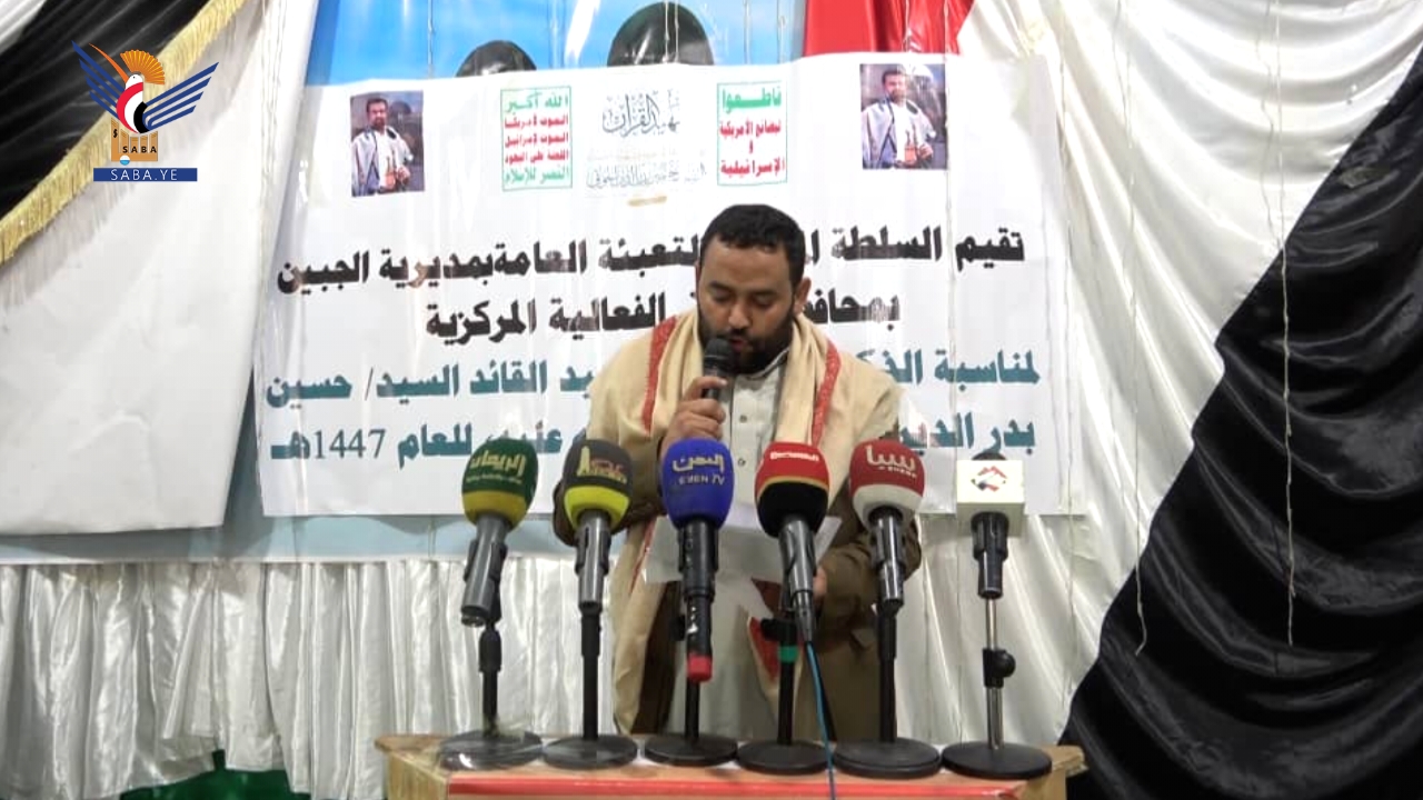 نظمت السلطة المحلية والتعبئة العامة بمديرية الجبين في محافظة ريمة اليوم، فعالية خطابية إحياءً للذكرى السنوية لشهيد القرآن السيد حسين بدرالدين الحوثي.