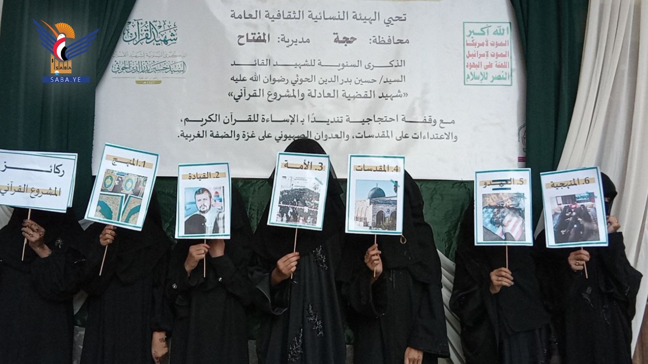 نظمّت الهيئة النسائية بمحافظة حجة، فعاليات خطابية ووقفات في عدد من المديريات بالذكرى السنوية لشهيد القرآن السيد حسين بدر الدين الحوثي للعام 1447هـ.