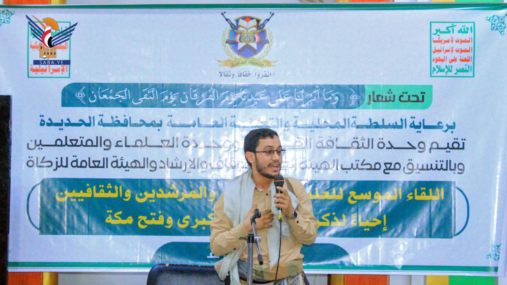 نظمت وحدتا الثقافة القرآنية والعلماء والمتعلمين بمحافظة الحديدة، اليوم بالتنسيق مع مكتبي هيئتي الأوقاف والإرشاد والزكاة ندوة ثقافية تحت عنوان قوله تعالى "وما أنزلنا على عبدنا يوم الفرقان يوم التقى الجمعان" إحياءً لذكرى غزوة بدر الكبرى.