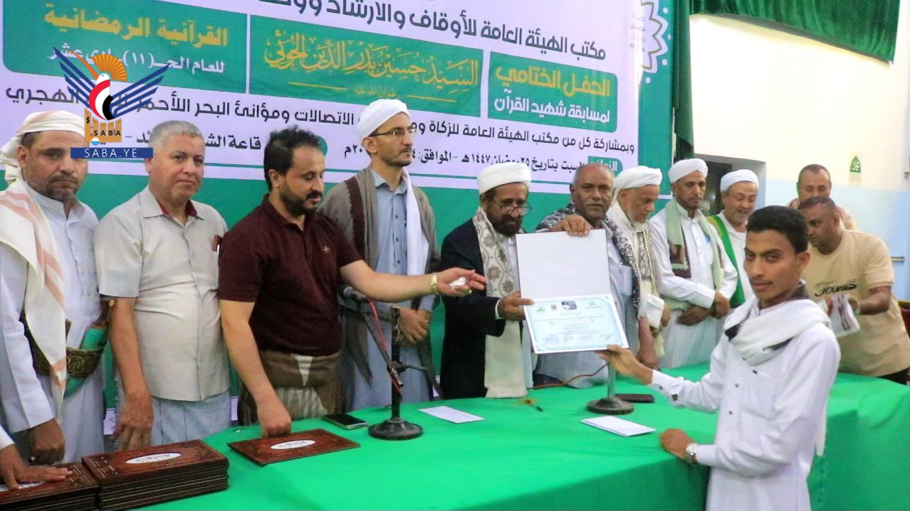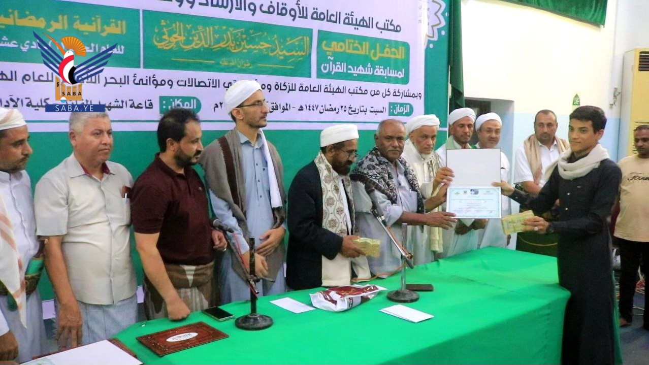 نظم مكتب الهيئة العامة للأوقاف والإرشاد ووحدة العلماء بمحافظة الحديدة، حفل اختتام وتكريم الفائزين في مسابقة الشهيد القائد السيد حسين بدر الدين الحوثي القرآنية الرمضانية في نسختها الحادية عشرة للعام 1447هـ، بمشاركة 121 حافظاً وحافظة من مختلف مديريات المحافظة.