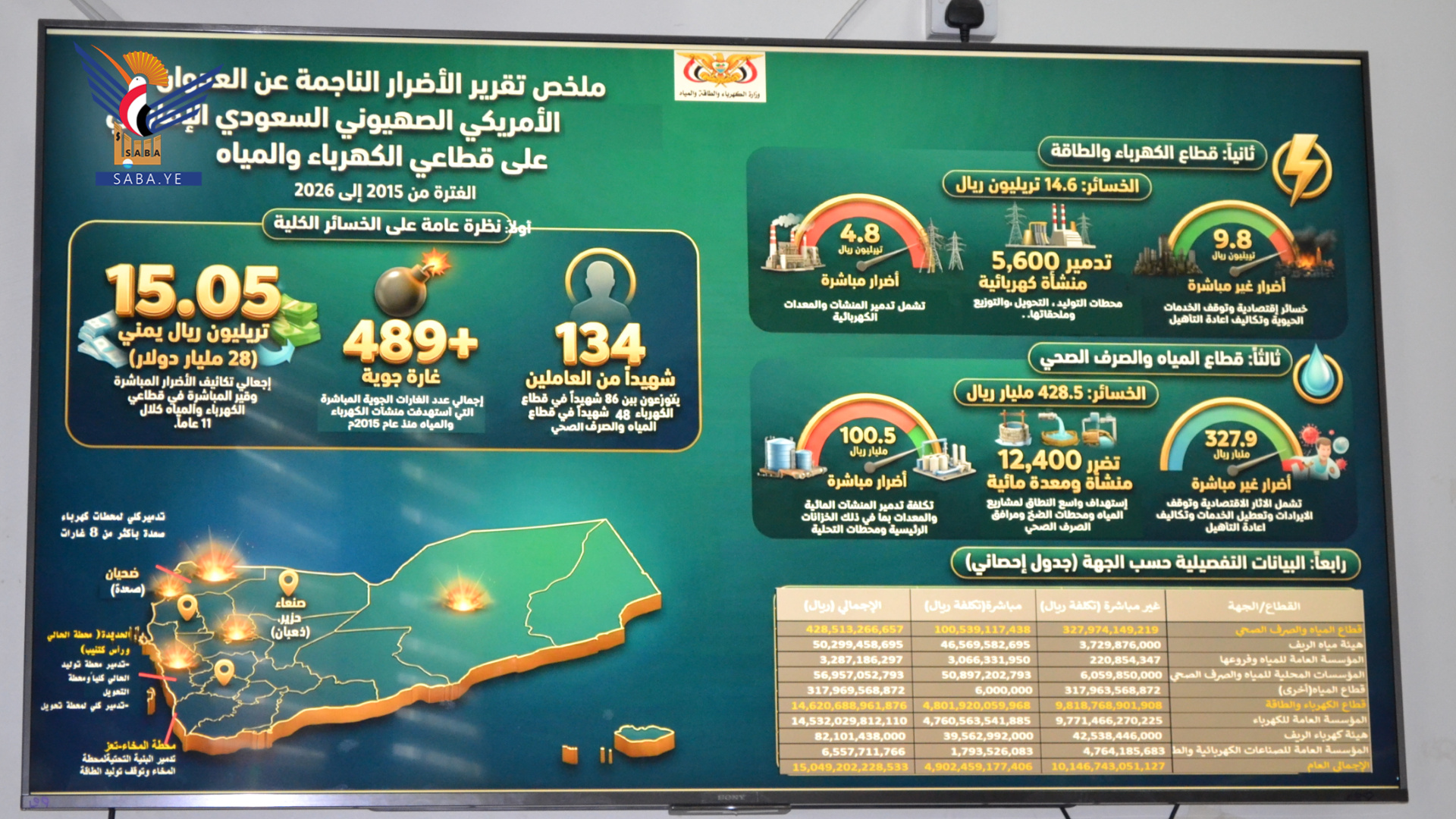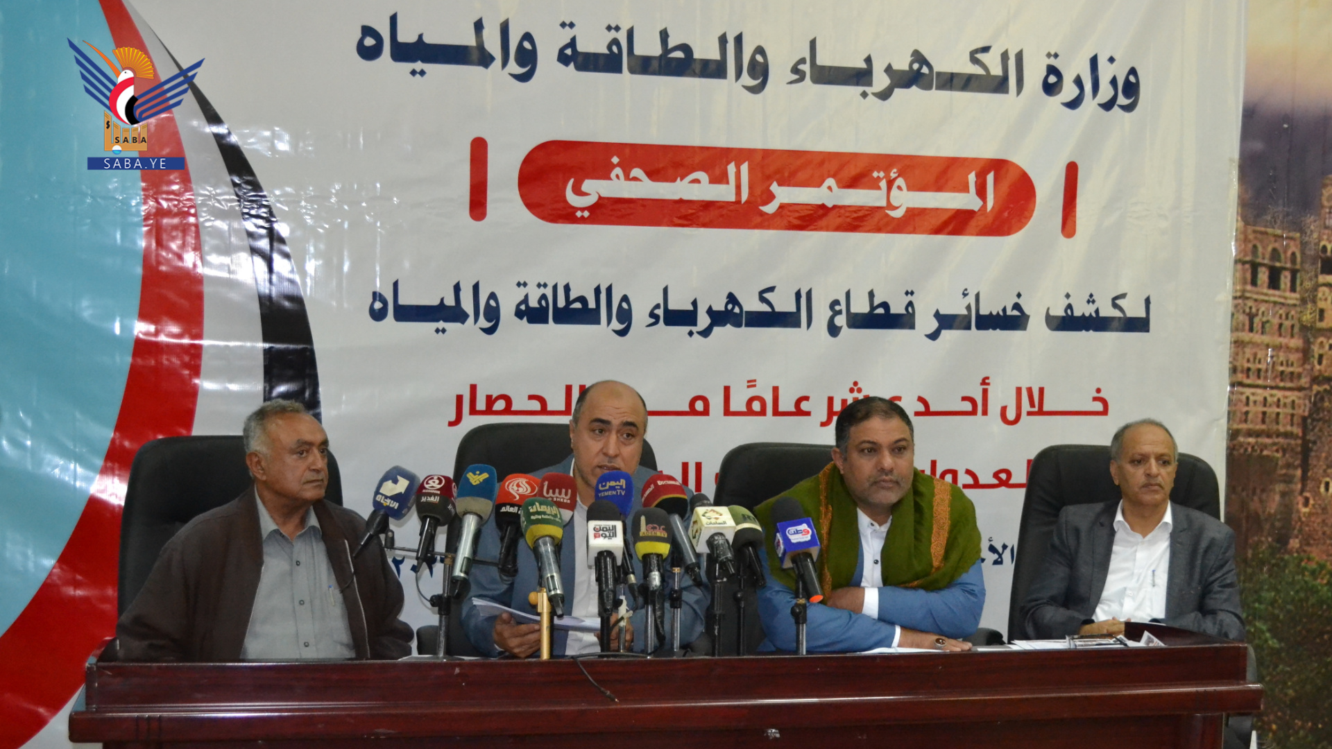 وفي المؤتمر الصحفي، كشف نائب وزير الكهرباء والطاقة والمياه عادل بادر، عن حجم الخسائر والأضرار الناجمة عن العدوان بقطاعي الكهرباء والمياه في 11 عامًا والتي بلغت 15 تريليون و94 مليارًا و202 مليون و228 ألف ريال، ما يعادل 28 مليار دولار.