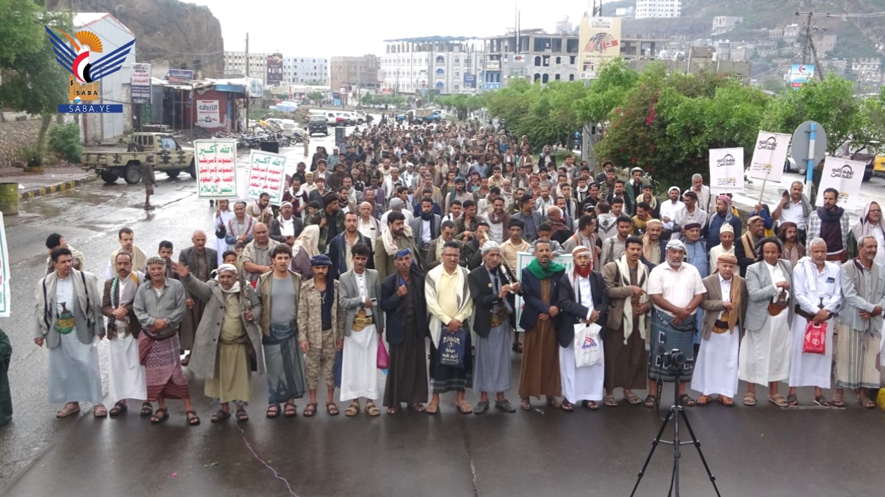 وجددت حشود محافظة تعز، التأكيد على المضي في درب التضحية والعطاء، والاستمرار في دعم وإسناد الشعب الفلسطيني، حتى تحقيق النصر الكامل وزوال طغيان الاحتلال الإسرائيلي الأمريكي، مؤكدة أن وحدة الصف وتماسك الجبهة الداخلية يمثلان ركيزة أساسية في مواجهة الأخطار، وتحقيق الانتصارات.