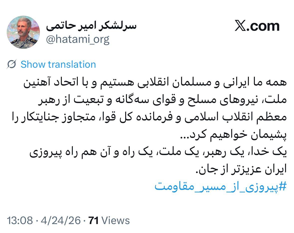 وأضاف حاتمي "إله واحد، قائد واحد، أمة واحدة، طريق واحد، وهذا هو طريق النصر لإيران، أغلى من الحياة".